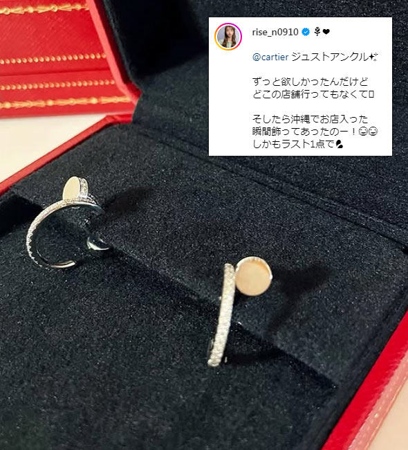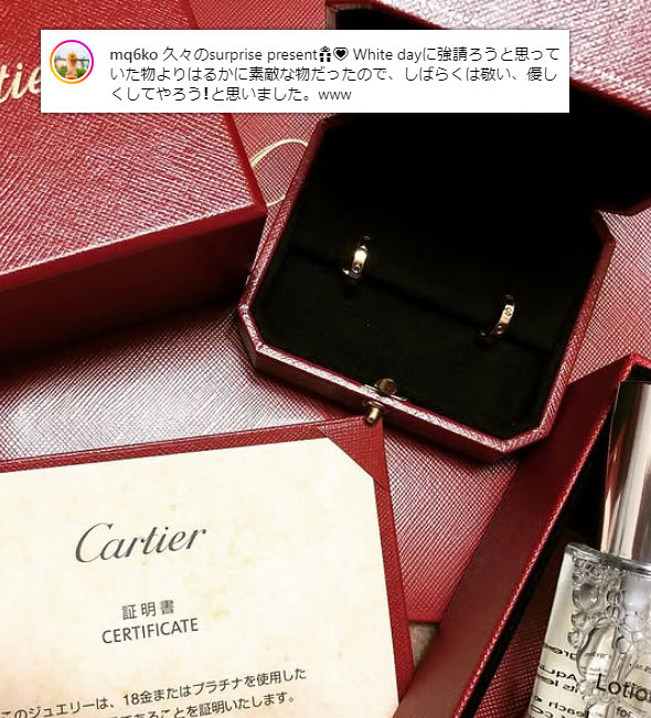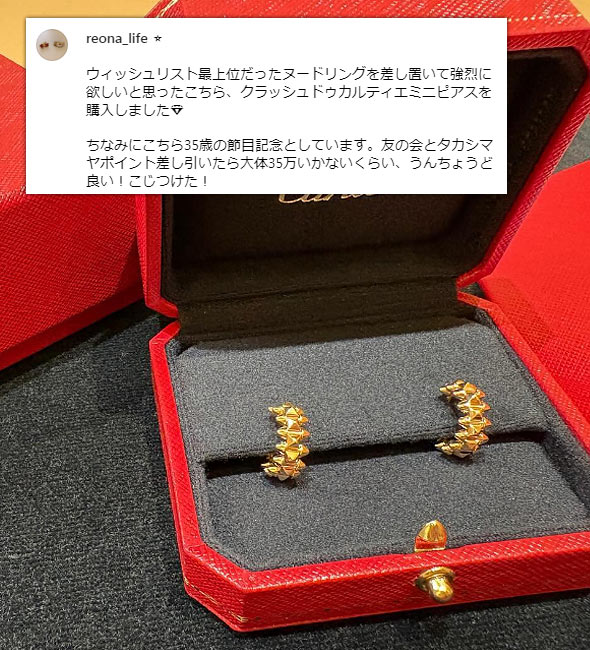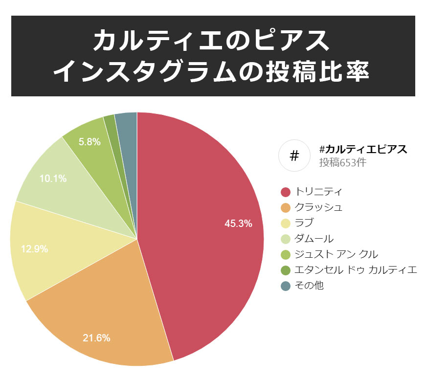 インスタグラムの「#カルティエピアス」653投稿の中から、女性が実際に着けている投稿、プレゼントされた投稿、自分へのご褒美で買った投稿、それらを集計し算出しました。