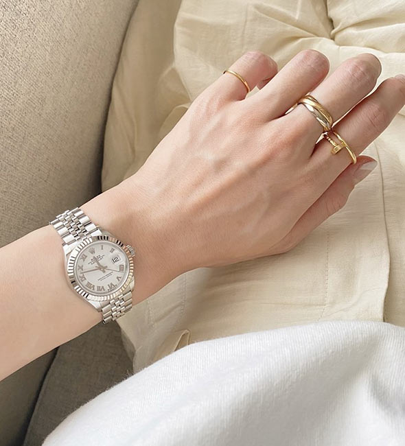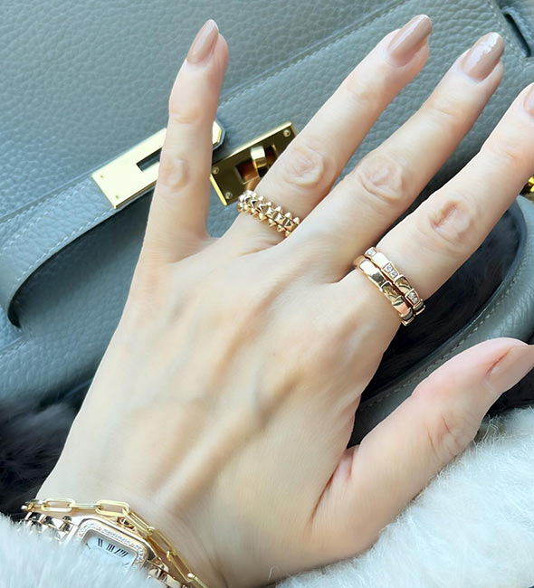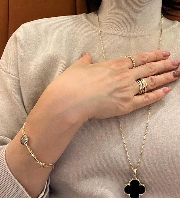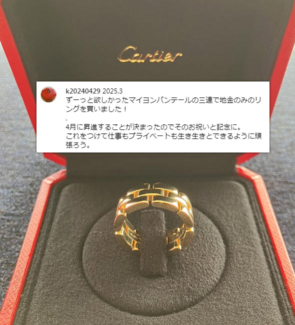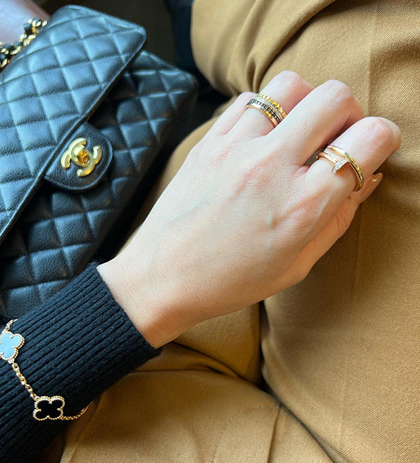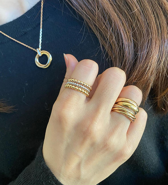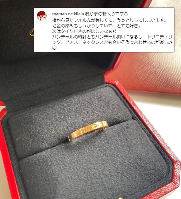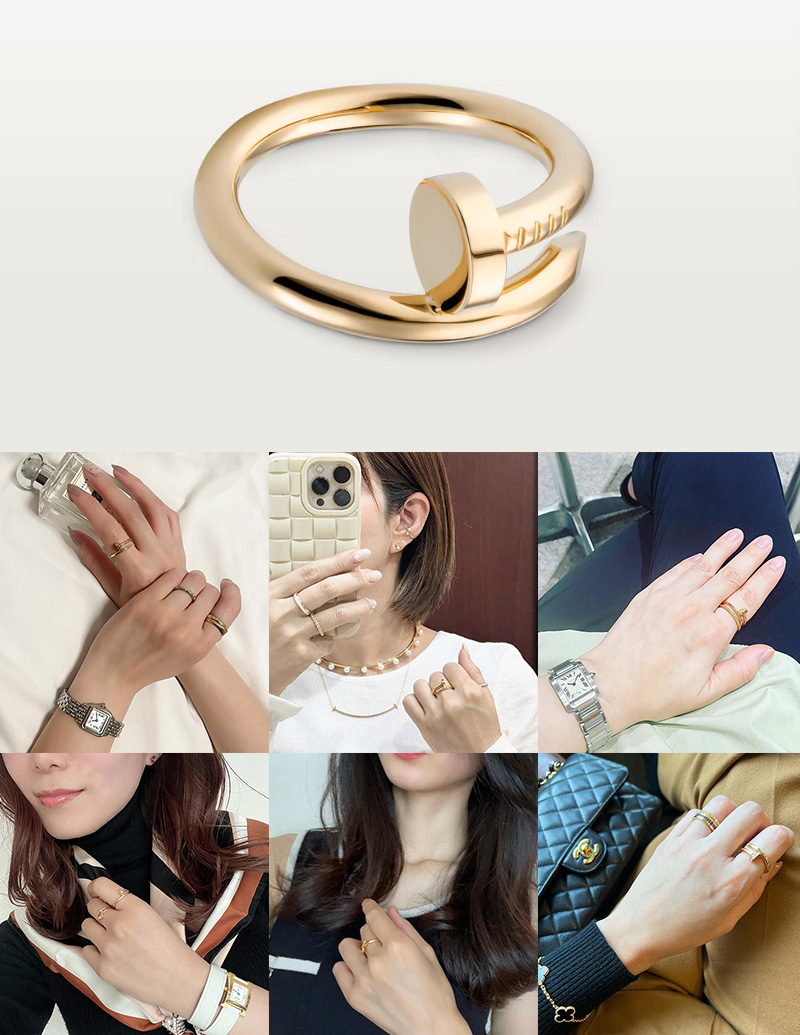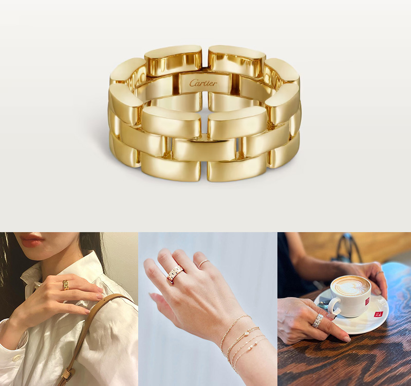 カルティエの2本目、3本目にはもちろんですが、持っておけばずっと愛せる一生物、そして他の指輪との重ね着けも楽しめるため、「カルティエの最初の指輪」としておすすめです。