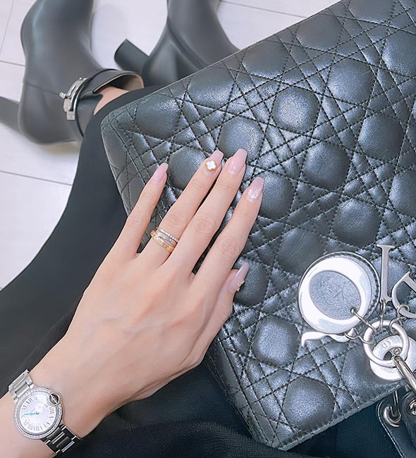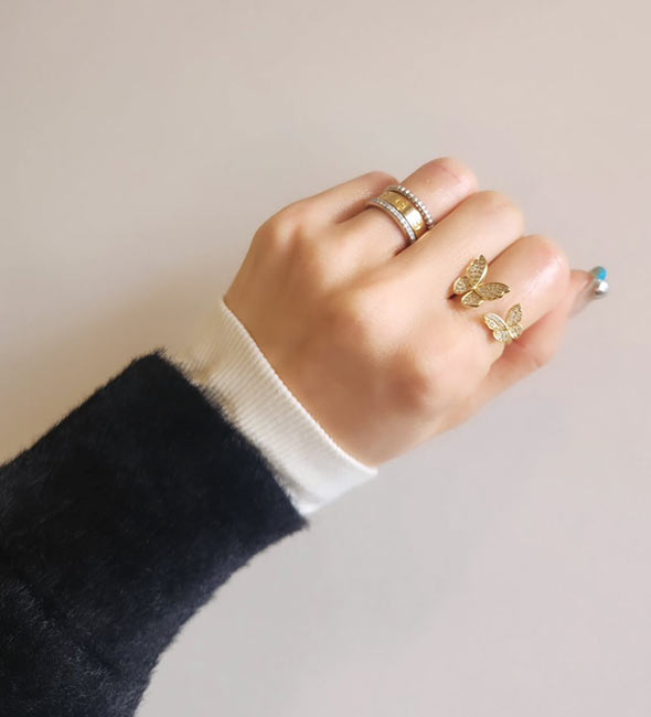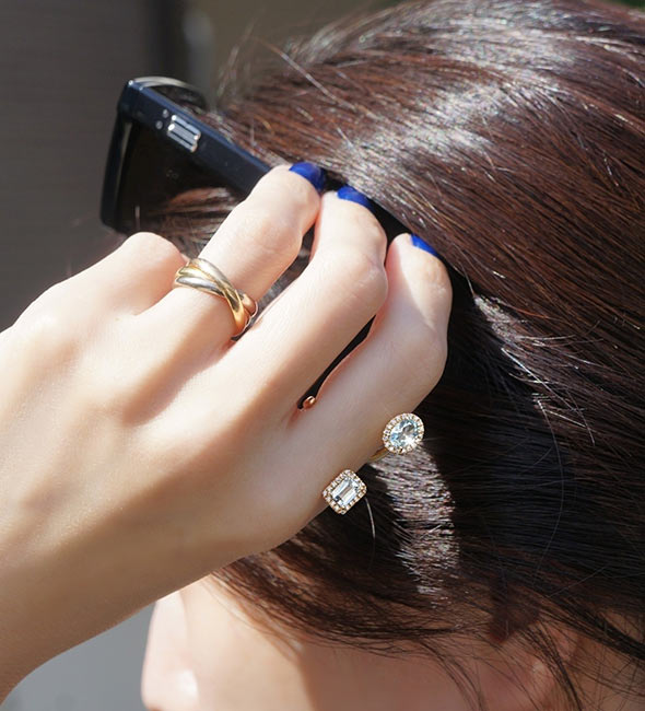 キリッとパンチのあるパンサーを着けるときは、他の指は、甘めにしたり、華奢なリングにしたりバランスを見て合わせます。