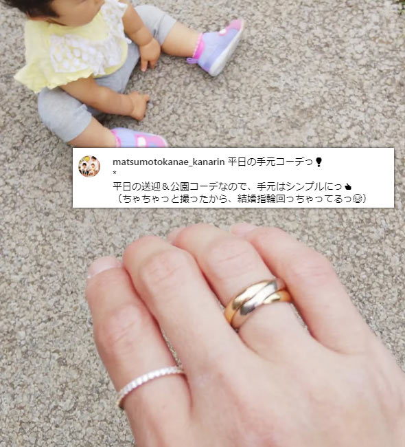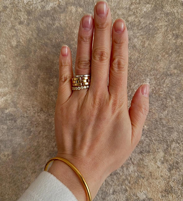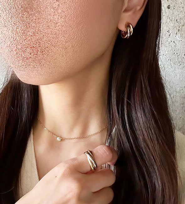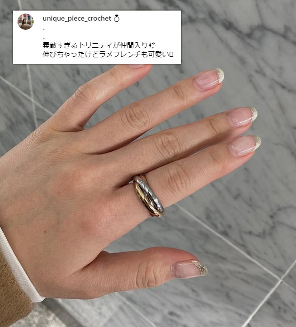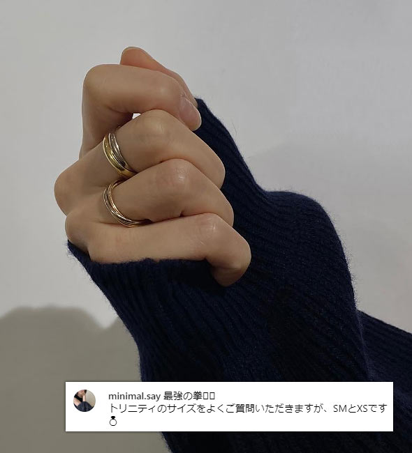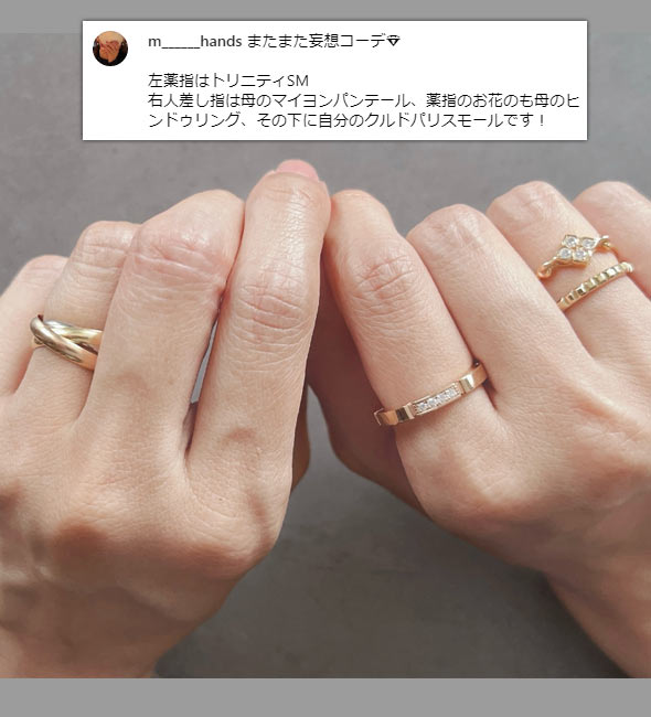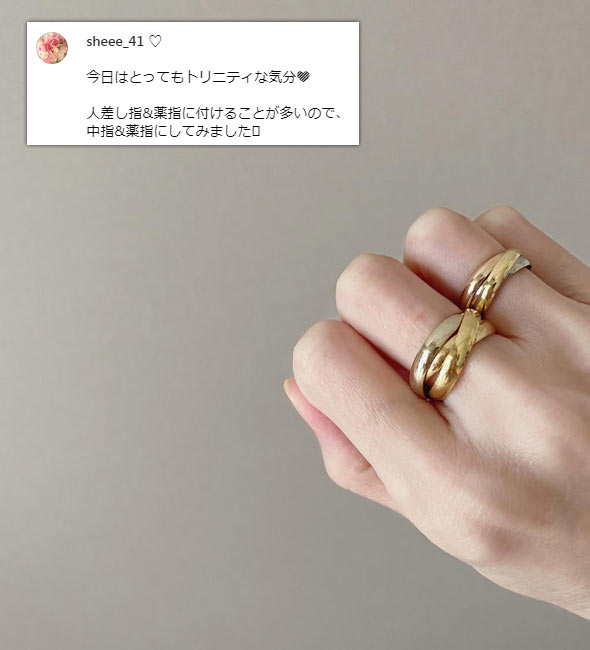 トリニティは3つの地金(PG、YG、WG)が使われているため、他の指輪と合わせやすい(どんな地金でも合わせられる)点も大きな魅力です。