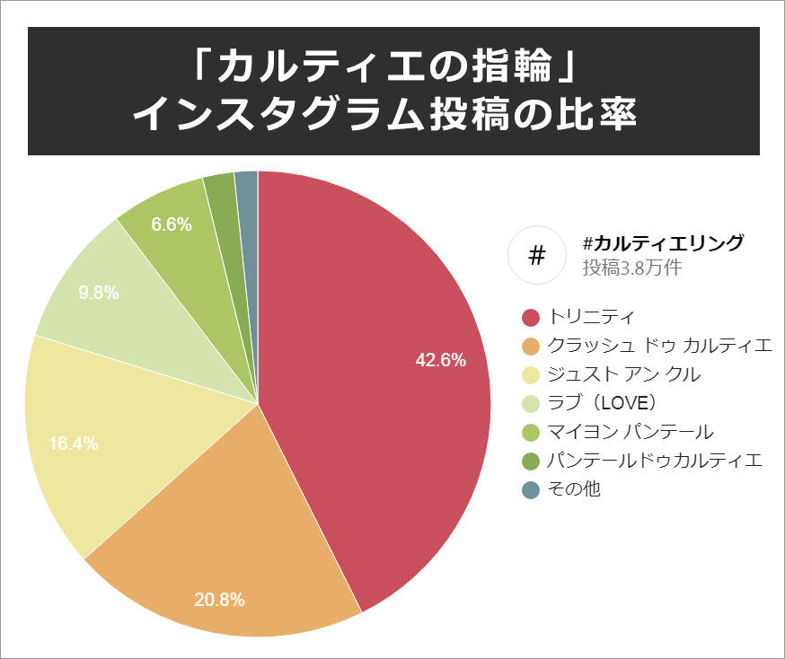インスタグラムの「#カルティエリング」38,000投稿の中から、女性が実際に着けている投稿、プレゼントされた投稿、自分へのご褒美で買った投稿、それらを集計し算出しました。