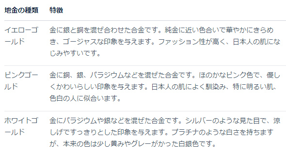 1番人気はイエローゴールド、次いでピンクゴールド、ホワイトゴールドの順となっています。