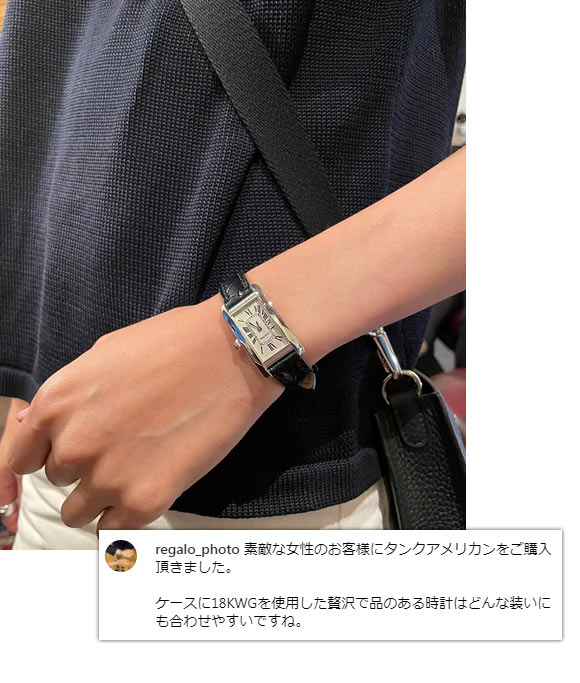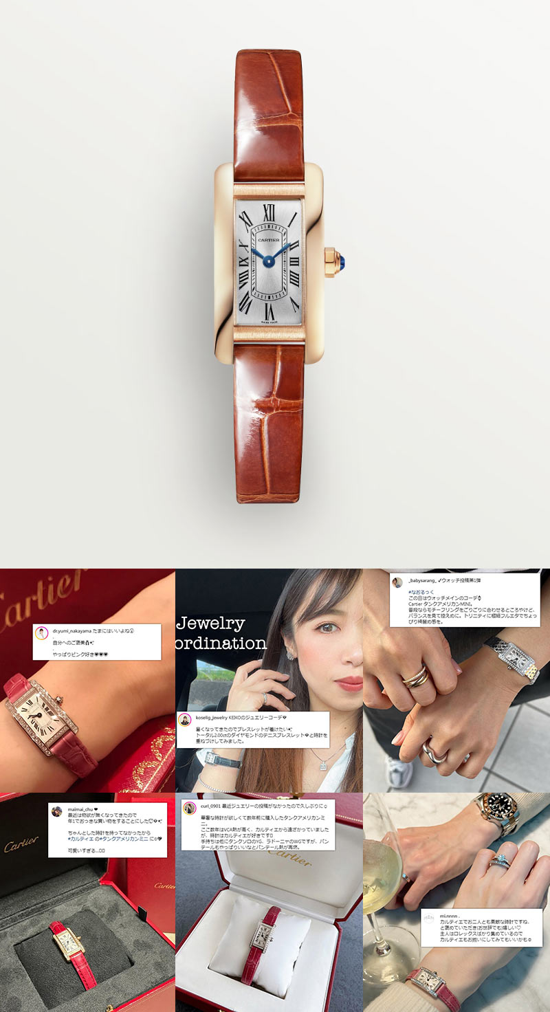 1921年に発表された「タンク サントレ」を基に、1989年に誕生。縦長のケースが特徴で、知的かつ優雅な女性らしさ印象を放つ「タンク アメリカン」。
