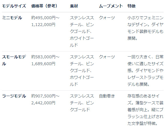 60万円~95万円。特に手が届きやすいクォーツモデルが人気です。カルティエのデザインを手軽に楽しめ所が、男性・女性に支持されています。
