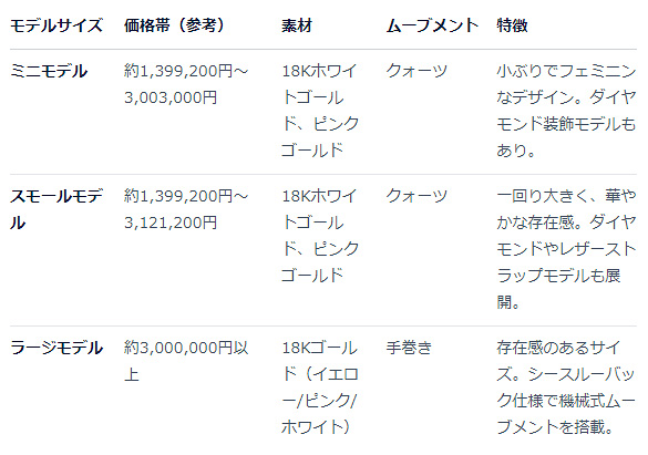 贅を尽くした作りゆえに「高いステイタス性」を兼ねそなえ、価格は最低でも160万円から。「最高のカルティエ時計」を求める方に相応しいモデルです。