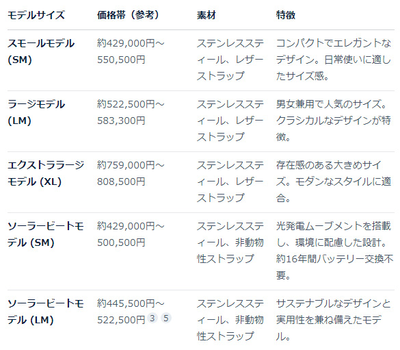 全体的な価格帯はエントリーモデルの40万円から、ゴールドやダイヤを使った100万円以上まで広いです。