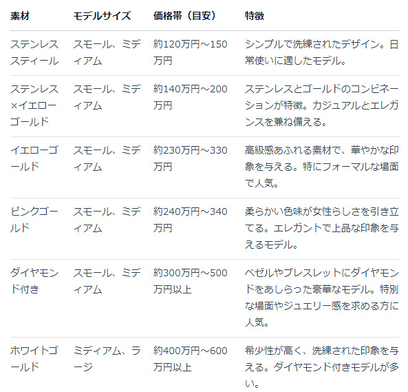 特にステンレスモデル(70万円~)と、ゴールドのコンビモデル(130万円~)の2モデルが人気です。