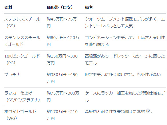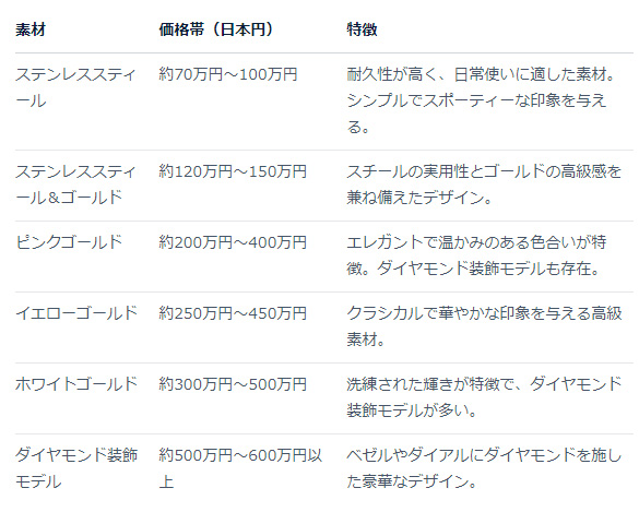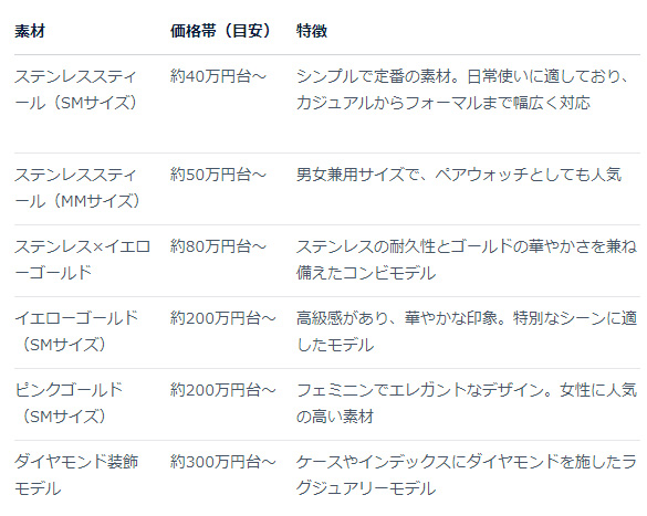 特にステンレスモデル(50万円台~)と、ゴールドケースモデル(120万円台~)の2種類が安定して人気です。