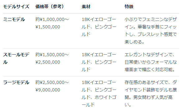 昔から「女性の憧れの高級腕時計」としてずっと人気が継続しており、ハイジュエリーと共に30代~50代という“大人”に選ばれる年齢層も特徴です。
