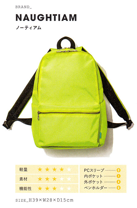 シンプルなデザインながら、インパクト大の蛍光イエローカラーのバックパック。日常シーンでカジュアルに持てる、薄手のナイロン素材の軽量な作り。使いやすいダブルファスナー仕様。