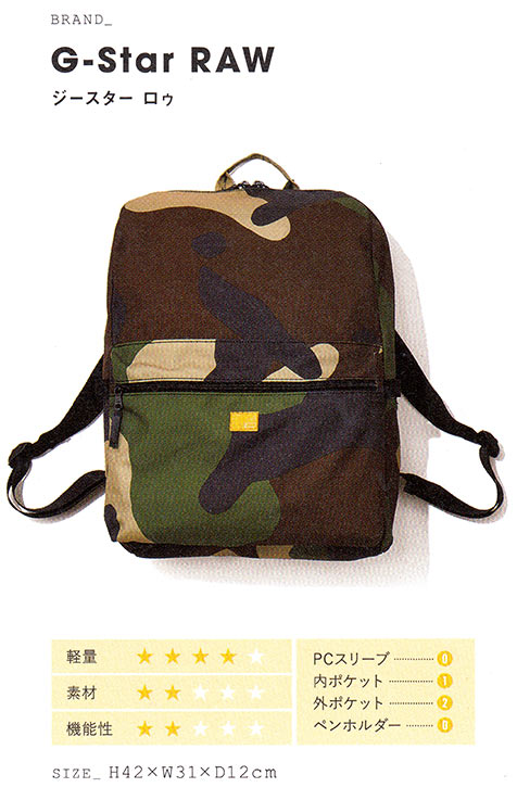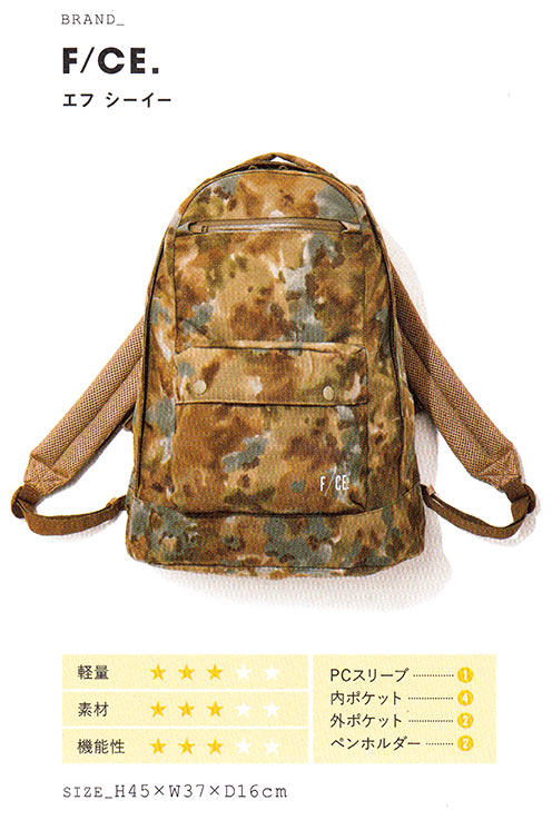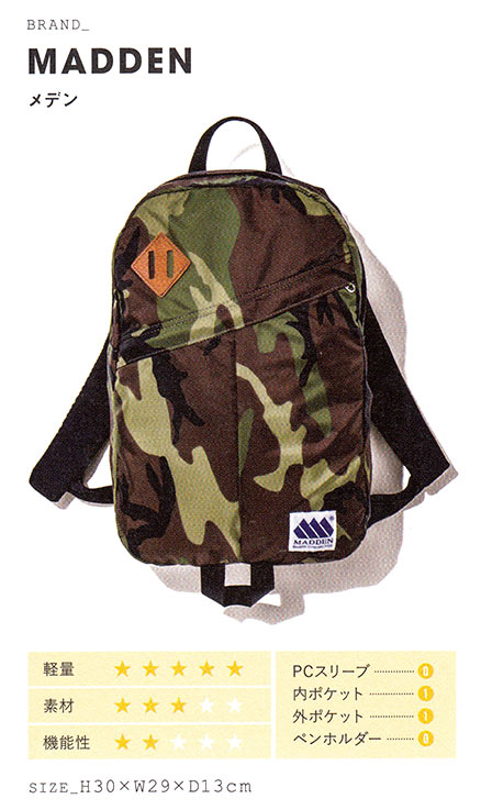 カーキカラーやカモフラ柄をボティにデザインした、どこかミリタリーらしさを感じさせるリュック。