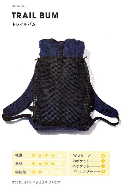 簡単に荷物にアクセスできる、ロールトップ使用のメインコンパートメントが魅力。フロントのメッシュポケットは、すぐ取り出したいものを入れるのに便利。デイリーユースに最適な13~19L。