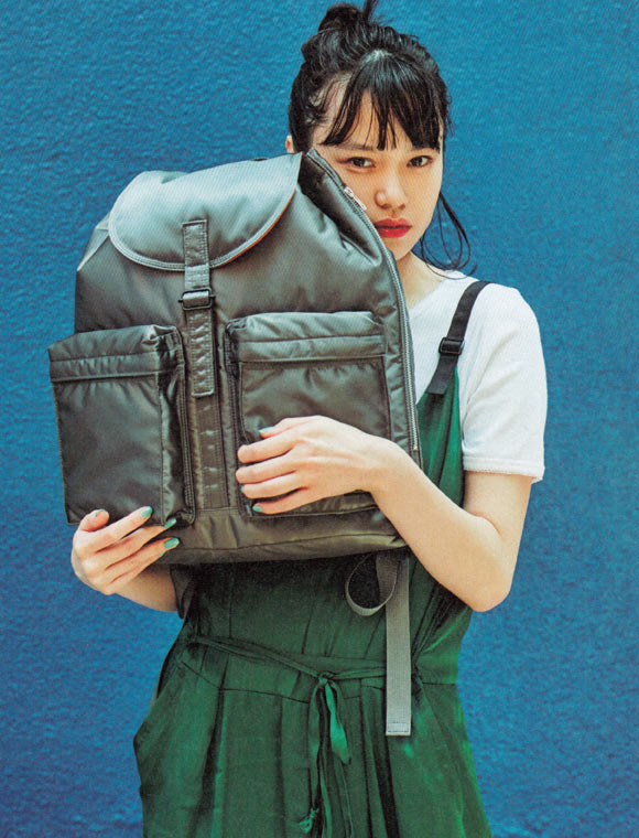 底を厚紙で巻いてミシンで縫い留めるという手法を用いた、粉袋をモチーフとしたデザイン。荷物の量によってシルエットの変化を楽しめる。