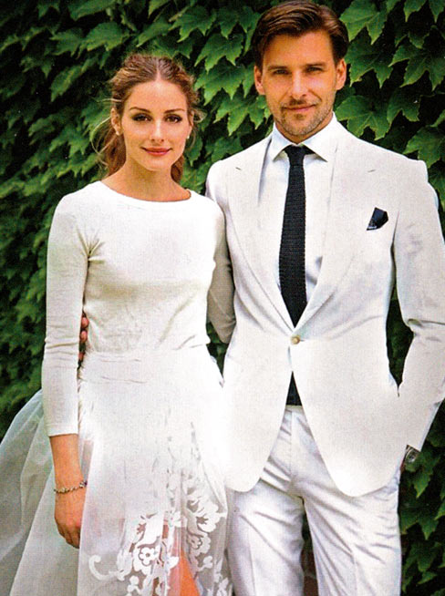 絵になるカップルナンバーワン! オリヴィアはクリーム色のセーターに白いショーツとチュール・スカート、マノロ・ブラニクのブルーパンプスを合わせて、ウェディングでもオシャレ番長の実力を発揮。
