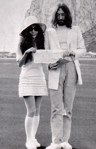 世紀のアーティストカップルは、ジブラルタルで挙式。ヨーコのミニスカートにハイソックス、麦わら帽子というドレス姿が斬新です。このふたりだからこそ決まっているのかも。