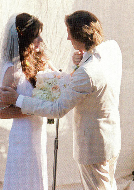 映画監督のポールと3度目の結婚を果たしたミラ。ダウンヘアにゴールドのヘッドピースを合わせてロマンティックに。ドレスは自身がデザインしたヴィンテージ風なものでした。