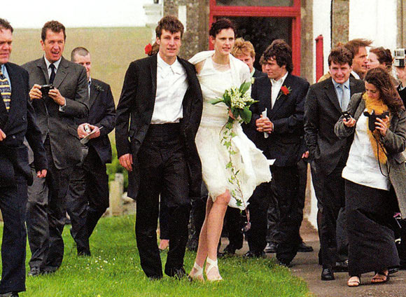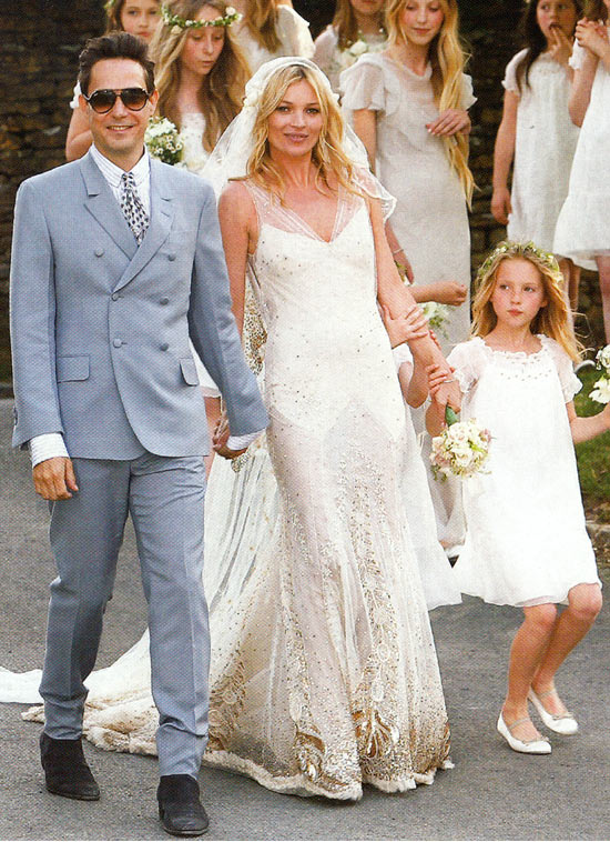オシャレモデルの代名詞・ケイトが選んだのは、ジョン・ガリアーノのすらっとしたノースリーブドレス。緩く巻いたダウンヘアもケイトらしナチュラル。イギリスの田舎町コッツウォルズで和やかに挙式しました。