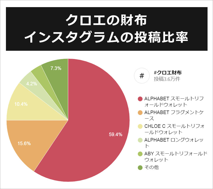 インスタグラムの「#クロエ財布」36,000投稿の中から、女性が実際に使っている投稿、プレゼントされた投稿、自分へのご褒美で買った投稿、それらを集計し算出しました。