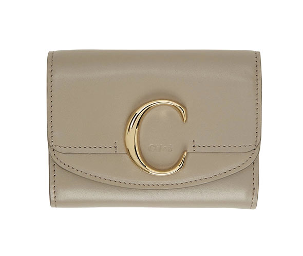 クロエのシグネチャー「C」モチーフを大胆にあしらった三つ折りミニ財布。品のある光沢と存在感がありながら、落ち着いた色味のレザーで日常にも馴染みます。
