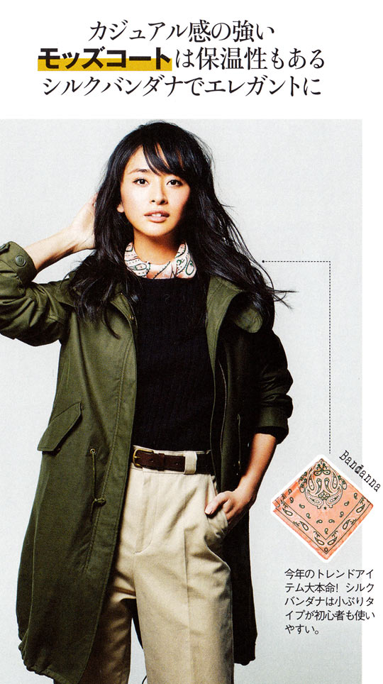 カジュアルになりがちなモッズコートには首元にスカーフを入れて 女らしさをプラスすると甘辛MIXのバランスがちょうどいい。