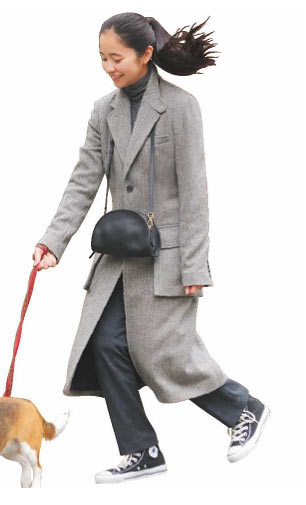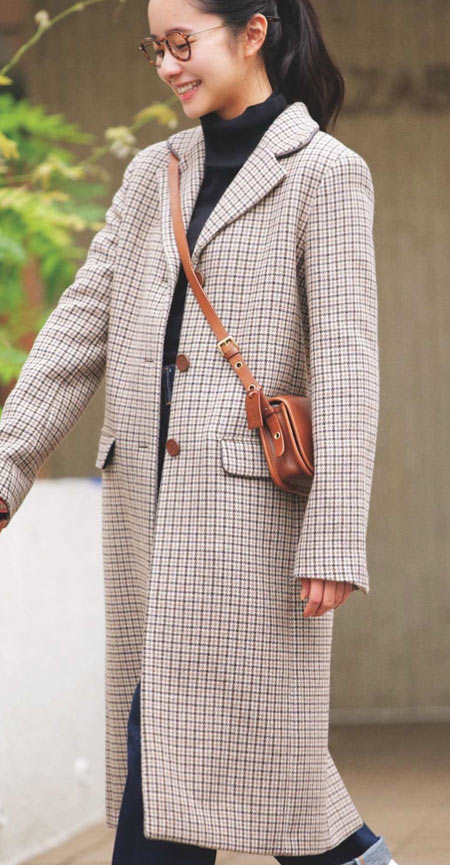メンズライクで少しビッグサイズのウールチェスターコートも、ブリティッシュな香りただよう細かなチェック模様で登場。襟やポケットのフチに茶色のレザーでパイピングを施し、ベージュ系の全体の色味をひきたてて。