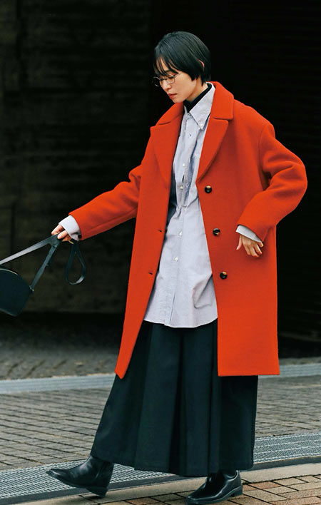 コーデを華やかに見せてくれるレンガ色の「A.P.C.」のチェスターコートは、この冬、是非チェックしておきたいアイテム。ミニマルにそぎ落とされたデザインですが、大きな襟とラペルが特徴的。
