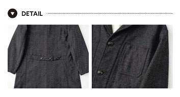 右:ダブルステッチの胸パッチポケットは、ワークコートの無骨さをアビールするディテールのひとつ。