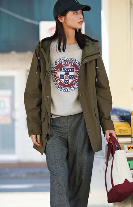異素材切替のデザインが大人スポーティな一着。着丈が長すぎないのでもたつかず、着膨れ感も無く着用できるアイテムは秋冬マスト。