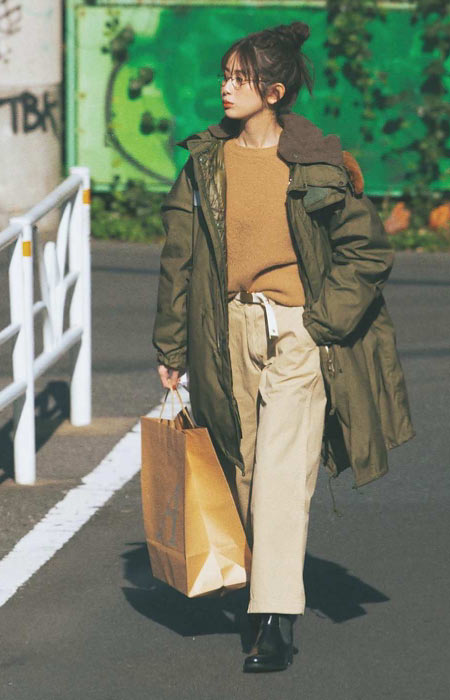 ゆったりとしたデザインなので、なかにトレーナーや厚手のニットも着ることができます。