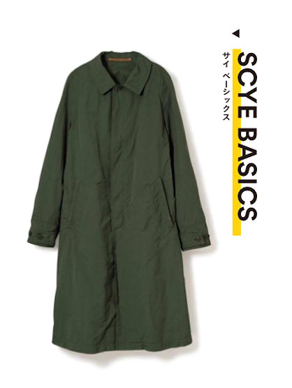 このステンカラーコートは、SCYE BASICSの定番として展開しているアイテム。今季はネイビーに加え、新色のセージグリーンが登場。