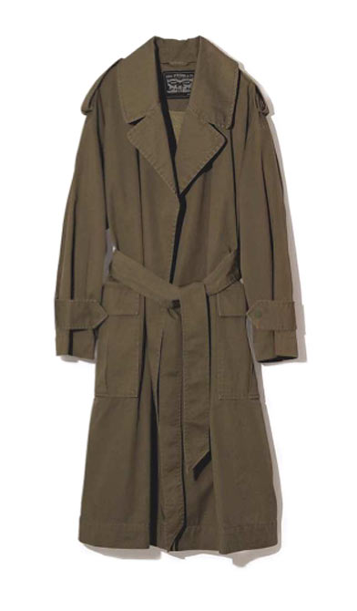 トレンチコートの原型「タイロッケンコート」。特徴は、ボタンやジップ代わりにベルトで固定するディテール。BIGシルエットが今季人気。