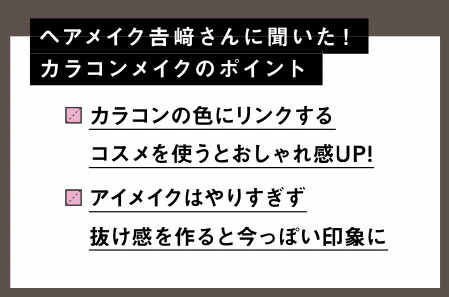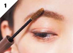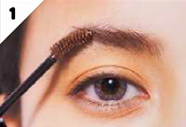 まずはAの眉マスカラで眉を少しだけ明るくカラーリング。COOLなグレーカラコンには優しい印象の眉で抜け感を。