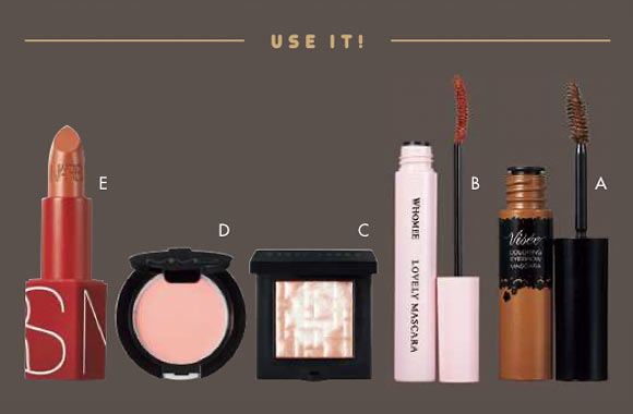 眉はAの眉マスカラでしっかり赤みをのせて女らしく。くっきり描かず、今どきな抜け感を残すのが重要!