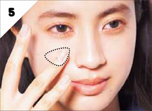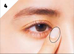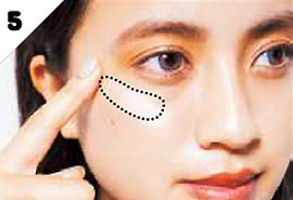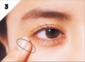 Cのピンク系のハイライターを、目尻の下の出っぱった部分にのせる。指先でしっとりなじませ、ナチュラルなツヤを演出。