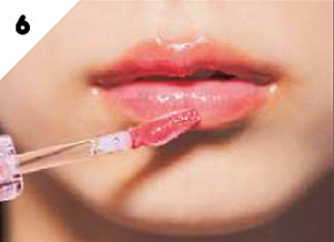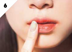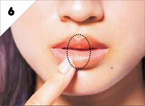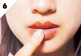 内側にのせたEのリップを指先でトントンと叩いてボカしていく。外側へ徐々に薄くなじませ、じゅわっとにじむような発色に。