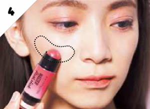 Dのナチュラルなピンクのクリームチークで、ほほにツヤと血色をプラス。下のほうに逆三角形に入れて、甘すぎず大人っぽく。
