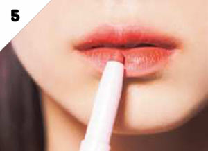 リップは韓国メイクの王道・赤のグラデーションに。マットなEのペンシルで、まずは唇の内側にだけしっかりと色をのせる。