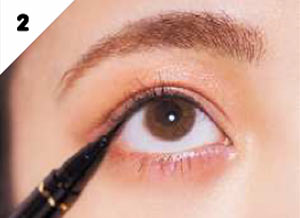 Bの黒のリキッドライナーの先端で上まぶたにインラインを。まつ毛の生え際の内側だけを埋め、目元を少しだけ引き締めて。