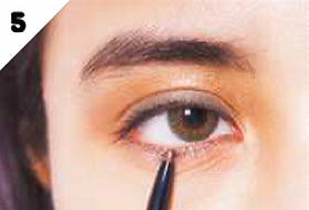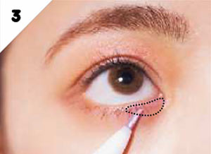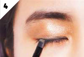 下まぶたのキワを、Cの明るめブラウンのジェルライナーで埋める。ニュアンスの囲み目でモード感がアップ!
