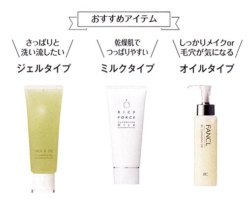 日焼け止め成分やウォータープルーフのメイクなど、洗顔だけでは落ちないこともあるので、メイクをした日はクレンジング剤を使って毛穴から汚れをきちんと取り除く作業からスタート。
