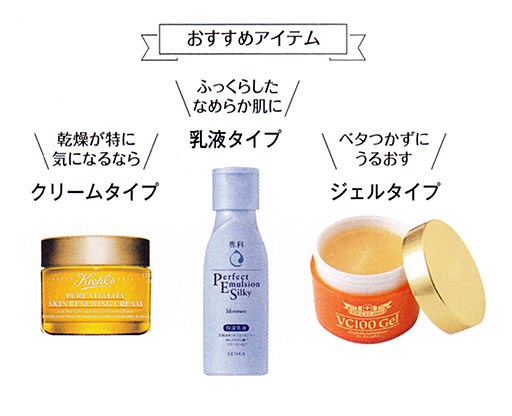 化粧水でうるおいを与えても、そのままだとどんどん肌の表面から水分は蒸発して乾燥の原因に。その上から乳液やクリームなどの油分が入ったアイテムでフタをするのを忘れずに。