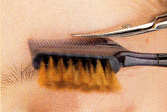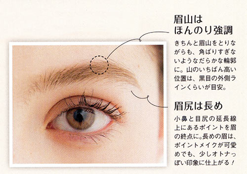 眉は短く切りそろえずに、長さをキープ。眉頭は上方向、中間から眉尻はだんだんと外側へ向かって流れるようセットして、立体感を出すこと。