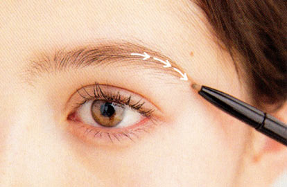 眉を描く前に、眉まわりの毛を処理して輪郭をしっかりと出す。チップ側で眉全体をなぞったあと、ペンシル側で眉尻中心に描き足す。