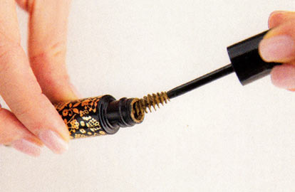 fのマスカラは、眉につける前に容器の口でブラシをしごいて液を落とす。ぼてっとつくのを予防する。