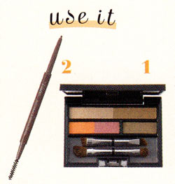 1の右上の色で眉全体を描いたら、ピンクをふんわりとのせる。眉尻側の薄い部分は、2のペンシルで眉山を決めて描き足していく。