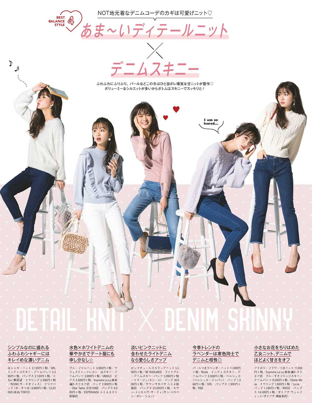 ふわふわにふりふり、パールなどこの冬はひと目ボレ確実な甘ニットが豊作❤ ボリューミーなシルエットが多いからボトムはスキニーでスッキリと!