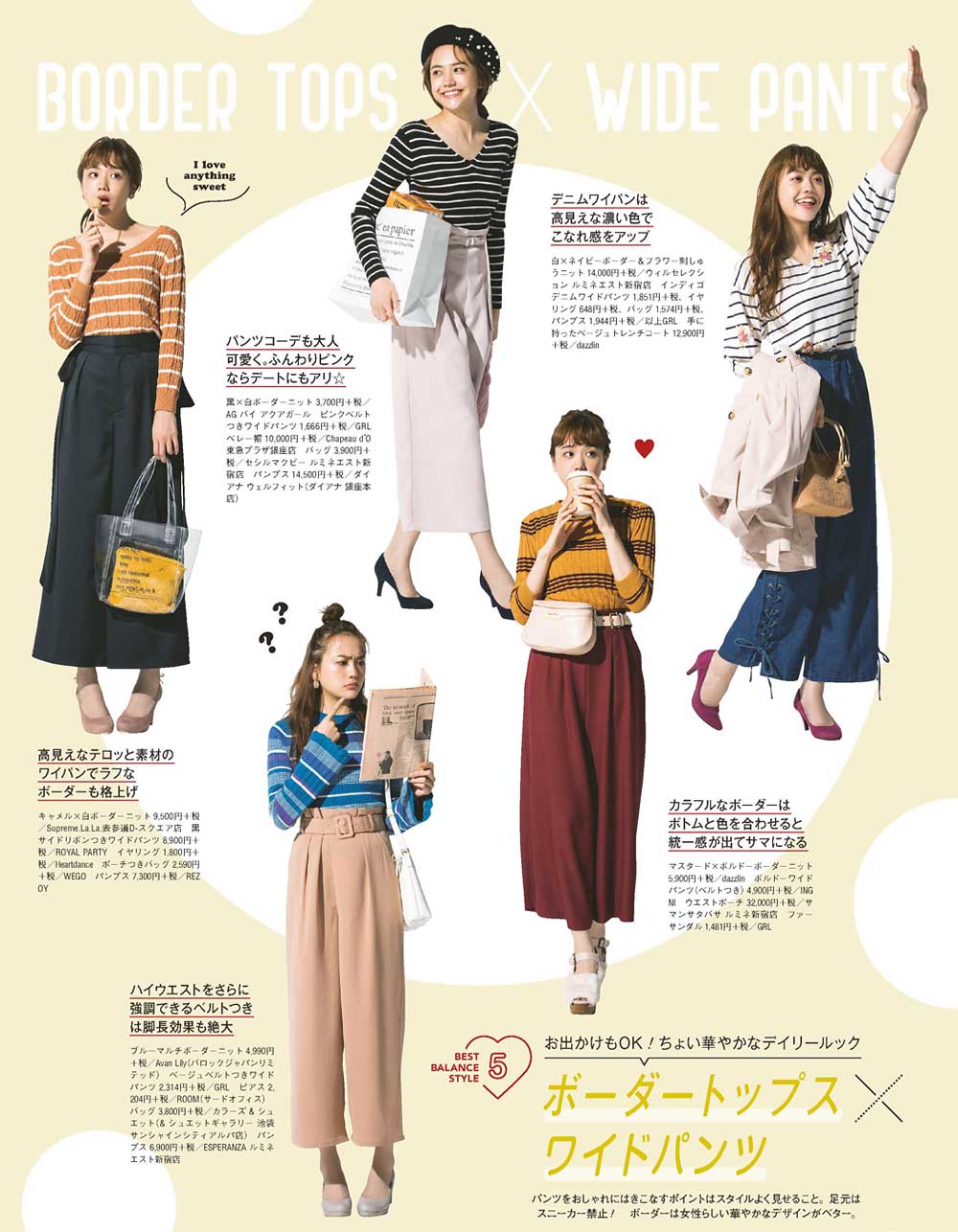 パンツをおしゃれにはきこなすポイントはスタイルよく見せること。足元はスニーカー禁止! ボーダーは女性らしい華やかなデザインがベター。