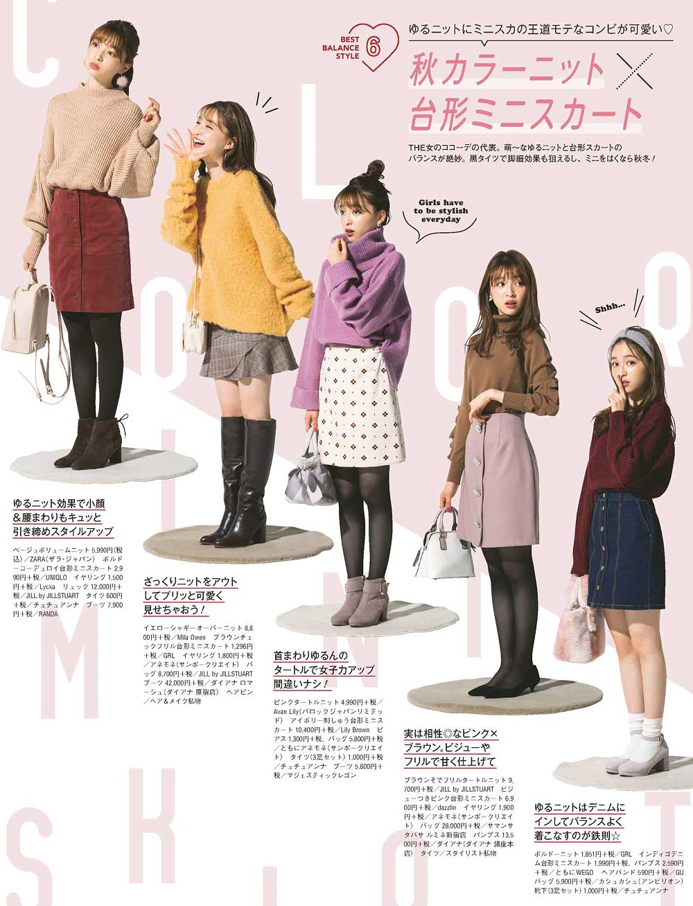 THE女の子コーデの代表。萌~なゆるニットと台形スカートのバランスが絶妙。黒タイツで脚長効果も狙えるし、ミニをはくなら秋冬!