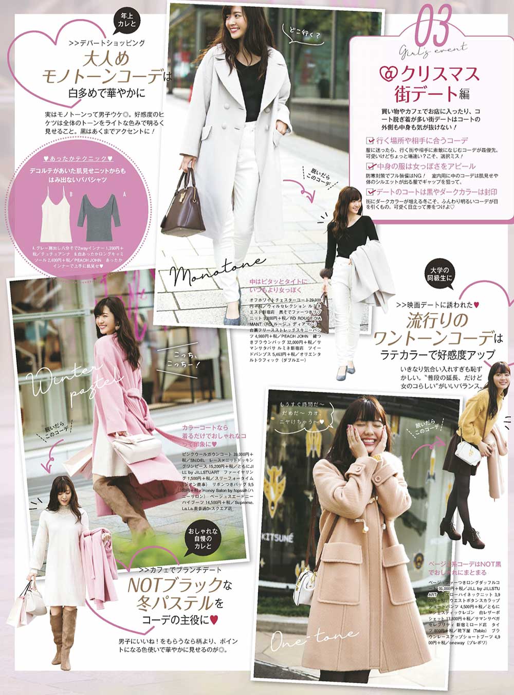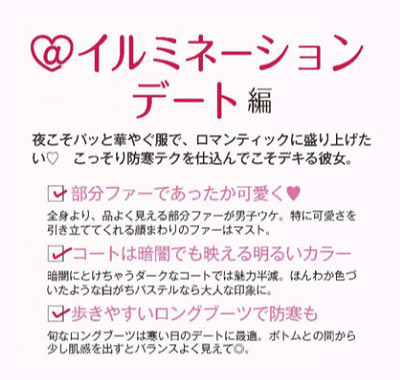 (下右)素敵なレストランでごはんを食べてからイルミネーションを見に行くのが理想です。そんな日だからいつもより女のコっぽさ強めがいいかな。ピンクと白でふわふわ女子になったよ。