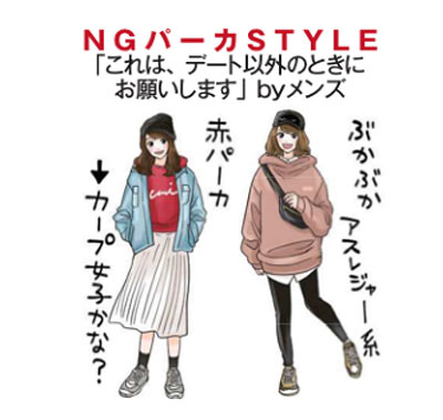 赤とかビビッドなパーカって、ユニフォーム感が強すぎるので避けましょう。また、キャップ×パーカはカジュアルすぎるので、こちらも避けるのが無難です。